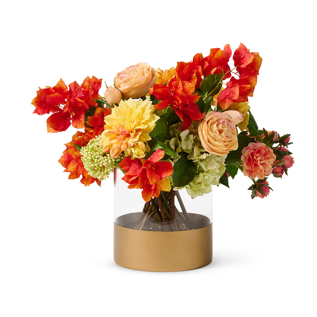 Glowing tones of golden dahlia, apricot rose and flame-colored bougainvillea come together in a gold-toned glass vase with rich, festive elegance. The making of artificial flowers is an ancient art that originated in China's Tang Dynasty more than 1,300 years ago. Bountiful arrangements of color and texture, our exquisite greenery is meticulously shaped and painted by hand to perfectly mimic nature’s beauty.